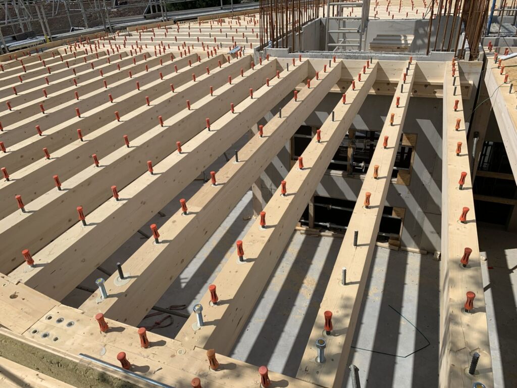 La halle de stockage de 4 niveaux comporte une structure porteuse en bois lamellé-collé à haute résistance ainsi qu’un système mixte bois/béton pour les dalles entre étages.